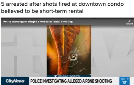 2020年10月,两颗子弹穿过York Street一套非法短期出租公寓的墙壁,将多伦多“幽灵酒店”曝光成为头条新闻。前市议员Joe Cressy当时称,多市“迫切需要像Airbnb这样的短租运营商将不符合”市政分区和税收要求的房产“下架”。