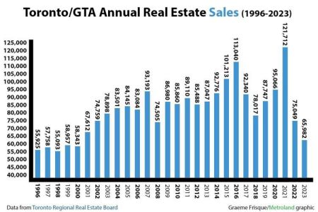 加国最大城市及其周边社区的房地产交易量刚刚创下世纪之交以来的新低。据Metroland报道,多伦多地区地产局(TRREB)报告,多伦多和大多伦多地区的2023年最终销售数据为65,982套。这是自2000年以来房地产交易数量最少的一年。