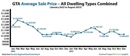 上个月,多伦多和GTA地区所有住宅类型的平均价格为1,084,692元,共有3,444笔交易,而2022年12月的平均房价为1,051,216元,交易量3,117套。