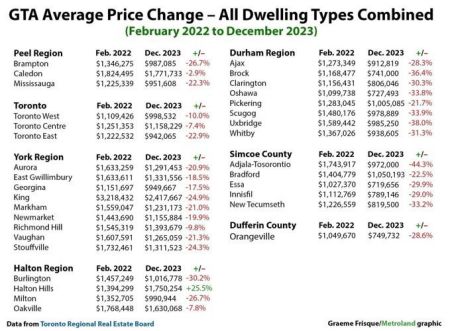 Halton Hills是数据中的一个异常值,12月的平均售价1,750,254元,上涨了25.5%。然而,上个月的均价远远超出了Halton Hills的正常水平。截至去年11月,该社区前11个月的平均售价仅为1,115,028元。此外,TRREB监测的所有社区自2022年2月以来房地产价格都下跌,一些社区出现大幅下跌。约克区King镇和Stouffville镇的跌幅超过24%。