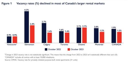 2023年,温哥华和渥太华的空置率保持稳定,但这些市场仍然非常紧张。事实上,温哥华仍然是加拿大最紧张的主要租赁市场,月平均租金最高。在最大的市场中,卡尔加里和埃德蒙顿的租金涨幅最大。多伦多、蒙特利尔和温哥华的租金也大幅上涨。(据51网、CMHC)