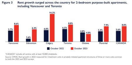 较低的空置率通常意味著租户之间的竞争更加激烈,并且房东提高租金的动机更大。加拿大全国两居室租金从上一年的5.6%急剧上升至8%,租户平均每月支付1,359元,增幅超过了通货膨胀(4.7%)和工资增长(5%)。