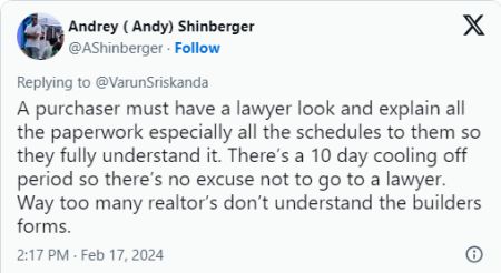 “这是房地产商与受无法完成交易困扰的买家之间众多诉讼之一!” 一位房地产经纪在X上写道。“听说有些困扰的卖家认为他们可以简单地退还单位而没有任何后果(除了可能失去押金)。这不是正确的态度。请咨询律师!”