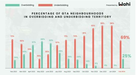 根据房地产数据平台Wahi最新发布的市场报告,在春季销售旺季到来之前,大多伦多地区(GTA)已经有数十个社区重现抢高房价的现象,其中多个地区上个月进入了卖方市场。总体而言,2月份,GTA房地产市场中有76个社区(25.1%)的房产成交价格出现出价过高(Overbidding),而1月份为0%。另有17个社区(5.6%)以要价出售,210个社区(69.3%)出价过低(Underbidding)。