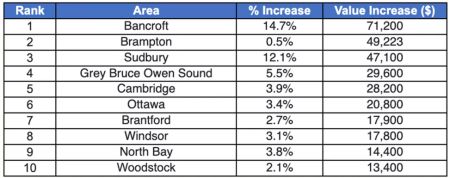 接下来是Brampton,房价从984,450加元涨至1,033,673加元,一年涨幅49,223加元,涨幅是0.5%。随后是Sudbury,房价从390,800加元升至437,900加元,增幅47,100加元,增长了12.1%。前五名还包括Owen Sound,平均房屋价格上涨29,600加元(涨幅5.5%),以及Cambridge,价格上涨28,200加元(增长3.9%)。