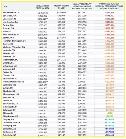 结果发现,美国主要城市包括纽约、迈阿密、纳什维尔、凤凰城、达拉斯、休斯顿和费城,在住房方面都比多伦多更便宜。总体而言,旧金山中等收入家庭的最大负担能力与房价中位数之间的差距最大,达到了惊人的644,338美元。