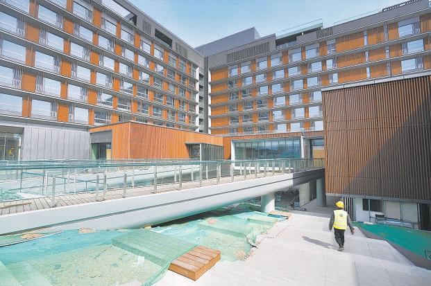 三层以上区域则是五星级酒店。其中酒店的大堂和宴会厅都位于地上三层,四至十层是客房,客房数达338间。今后,入住酒店的游客只需坐电梯下楼,再坐3站地铁,就可直达环球度假区,全程用时只需约15分钟。