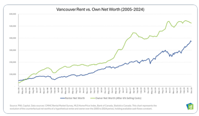 房主的净值包括本金及房价涨幅,扣除持有及交易成本,依据CREA公寓基准价格(2005年起可查)。成本包括税费、维护费、保险和贷款(月付20%首付、25年摊还、5年固定利率、按市场利率续约——总体较有利)。
