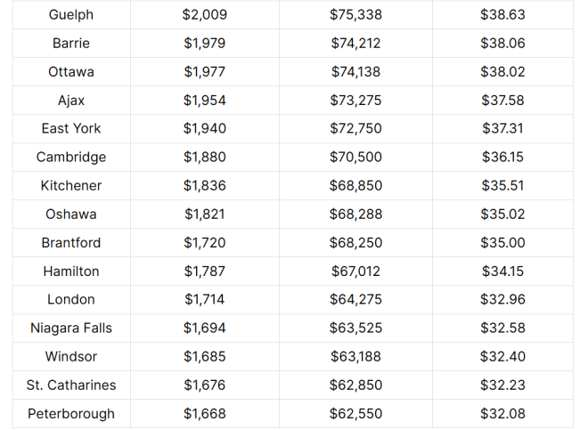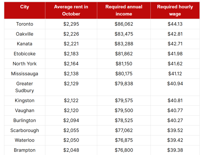 在大多伦多地区(GTA),北约克租客需时薪41.62加元;密西沙加需41.12加元;宾顿需39.38加元才能负担同类公寓。上述城市的工资缺口介于124%至137%之间。