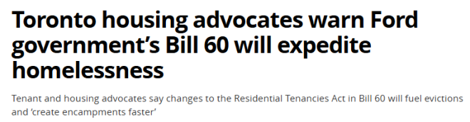 市住房事务局执行主任道格·罗林斯(Doug Rollins)在周一寄给议会的一封信中指出,这项法案中的13项与租赁相关的措施,都可能提高多伦多及全省的驱逐风险,并增加市府在“防止驱逐、住房稳定与租金援助”等项目上的压力。“这些改动限制了租客维护自身租约、上诉判决、寻求法律支援,以及在高房租市场中获得补偿搬家安置的能力。”——罗林斯在信中写道。