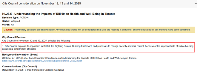 最终,市议会以23票赞成、1票反对、2人弃权的结果,通过了动议,正式通知省政府:多伦多市反对第60号法案中对《住宅租赁法》的修改,并反对任何削弱租客权利或租金管制的举动。
