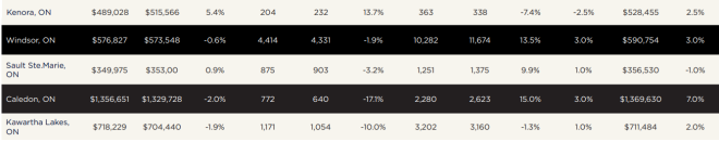 在RE/MAX分析的安省其他城市中,只有另外两个地区预计在未来12个月房价会继续下降,包括Kitchener-Waterloo(预计下降3%,至$711,101,尽管销售量将增长4%)和Kenora(预计下降2.5%,至$528,455,同时销售量增长2.5%)。