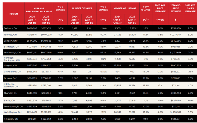 RE/MAX表示,在全省范围内,2026年按金额计算最便宜的房屋将在Sault Ste. Marie(平均价格预计降至$356,530)、Thunder Bay(约$405,493)、Kenora(约$528,455)和Sudbury(约$532,850),而最昂贵的则在Caledon(约$1,369,630)、约克区(约$1,278,387)、多伦多(约$1,037,354)和密西沙加(约$1,033,668)。