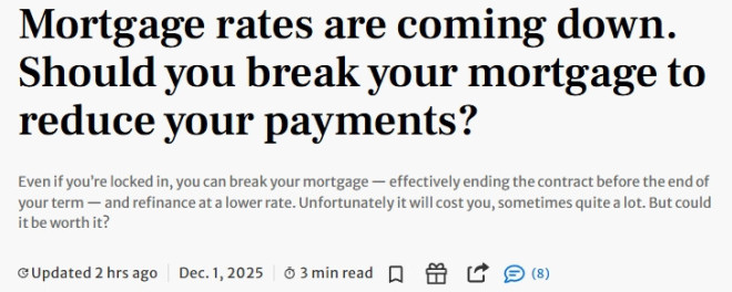 如果你在2022或2023年续了固定利率房贷,现在可能正感到后悔。自2023年10月以来,固定利率一路下降,根据Ratehub数据,截至11月底,五年期固定利率甚至低至3.79%。好消息是:即使你被“锁死”在固定利率里,你仍然可以选择提前终止现有房贷并以更低的利率重新贷款。但坏消息也同样明确:这样做会付出不小的代价,有时金额相当惊人。那么,值不值得?