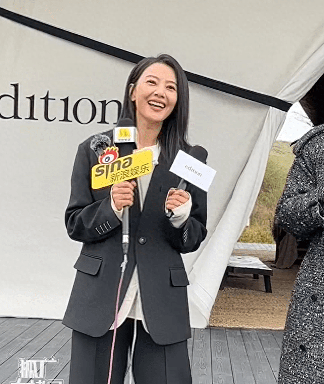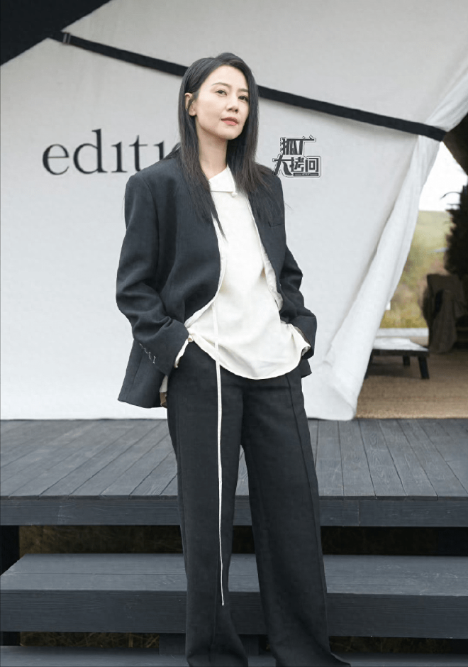 而高圆圆则身穿裤装,黑色西服和阔腿裤搭配白色内衬,垂下来的带子个性十足,整体非常帅气又干练。