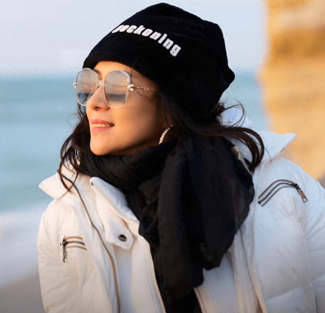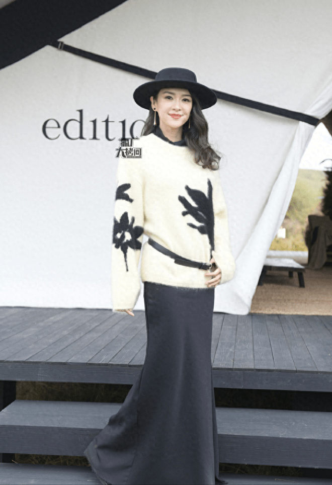 当天,章子怡打扮优雅,身穿黑色长裙,头戴黑色礼帽,搭配一件毛绒衫,整个人时尚又温柔。妆容也很精致,戴着充满设计感的耳环,气场很足。
