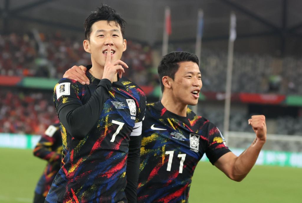 11月21日,韩国队球员孙兴慜(左)打入点球后庆祝。新华社记者贾浩成摄