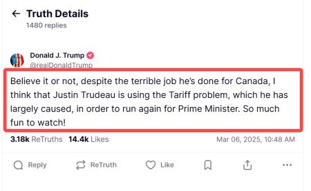 特鲁多在渥太华的一次儿童保育公告活动上被问及,“鉴于您的预计离任可能只剩几天时间,并且大选临近,您是否担心这会影响加拿大继续与美国谈判的能力?您是否考虑以某种形式担任看守总理,包括留任以维持稳定?”特鲁多回应道,“不会,我不会这样做。我期待在未来几天或几周内,将权力交接给合法当选的继任者。”此前,特朗普在社交媒体上分享了他所说的一次“比较友好”的电话通话细节。两位领导人于3月4日美国对加拿大进口商品实施25%关税后进行了交谈。