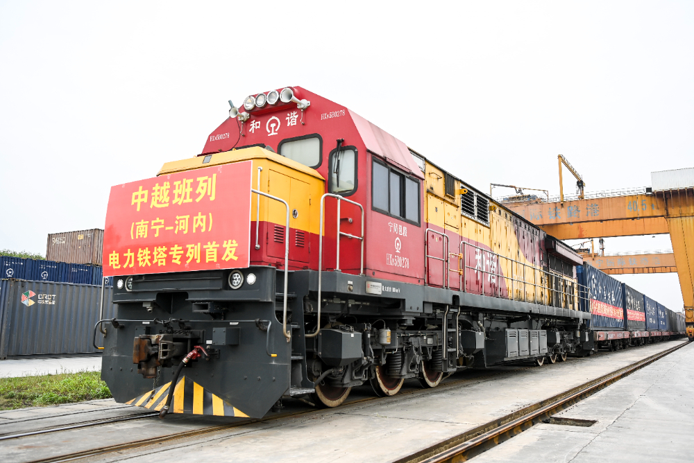 2024年3月8日,在广西南宁国际铁路港,电力铁塔专列准备发车。当日,一列满载340吨电力铁塔的中越班列从南宁国际铁路港开出,发往越南河内。新华社记者 曹祎铭 摄