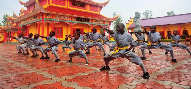 资料图:赞比亚首都卢萨卡市郊区的少林寺文化中心,学员表演中国功夫
