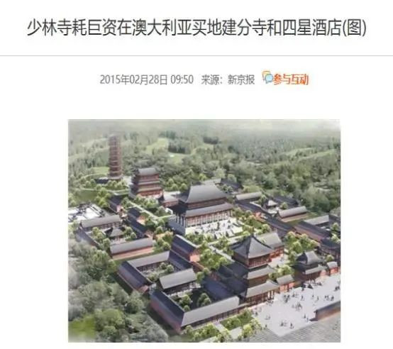 2015年,少林寺筹款约1950万元人民币,在澳大利亚购置土地用于建设少林禅修中心。2022年,继续斥资4.52亿元在郑州买地,打造“少林文化文旅综合体”,建设集文化展示、演出、住宿、文创、禅修体验于一体的文旅地标。
