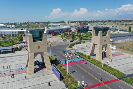 这是2024年7月26日在新疆霍尔果斯市中哈霍尔果斯国际边境合作中心拍摄的中哈连接通道(无人机照片)。新华社记者 丁磊 摄