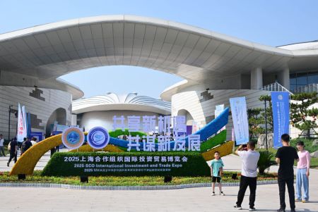 2025年7月18日,人们在青岛·上合之珠国际博览中心外拍照留念。新华社记者 李紫恒 摄