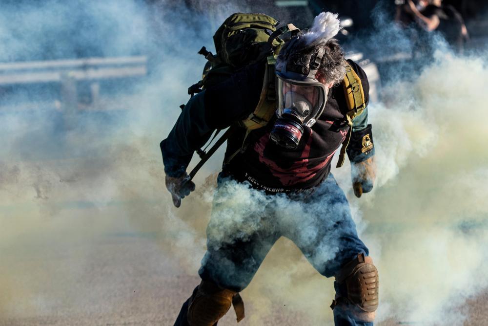 这是抗议者冒着执法人员发射的催泪弹与执法人员对峙。