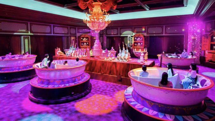 游客坐在摇摆旋转的杯状游乐设施上观赏《美女与野兽》著名场景。 tokyodisneyresort.jp