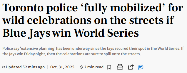 多伦多警方表示,他们已经做好应对准备。多伦多警方媒体发言人Nadine Ramadan表示:“多伦多是一座繁忙的城市,多种大型活动同时发生是常态。我们已经与合作伙伴就世界大赛和万圣节进行协调规划,完全有能力安全管理这两项活动。”
