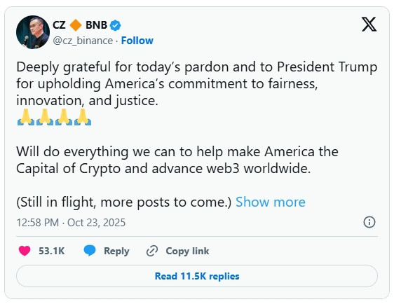 赵长鹏随后在社交平台 X(原Twitter)发文感谢,称自己“衷心感谢特朗普维护美国的公平、创新与正义”。