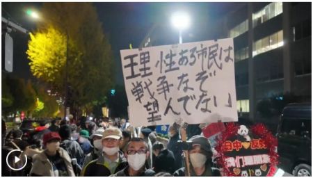 集会定于当地时间20时开始。19时前后,便有民众陆续赶到现场。抗议者们举着写有“撤回言论 反对战争”“因高市才有事”“高市下台”等标语的牌子,高喊“禁止军国主义复燃”等口号。多名抗议者要求高市对其涉台言论负责并辞去首相职务。