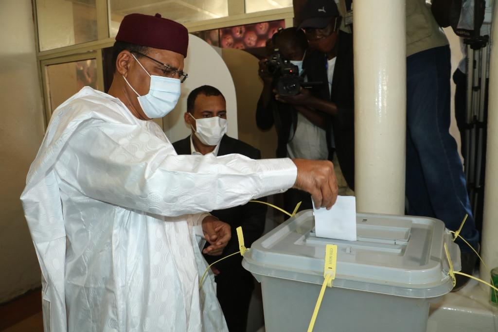 2021年2月21日,尼日尔争取民主和社会主义党候选人穆罕默德·巴祖姆(前)在尼亚美的一处投票站投票。新华社发
