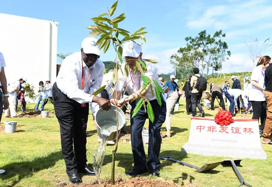 11月14日,参加中非农业合作论坛的嘉宾在海南省三亚市吉阳区大茅村共植中非友谊林。新华社记者 杨冠宇 摄
