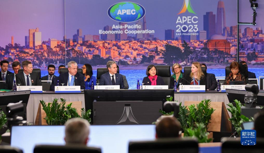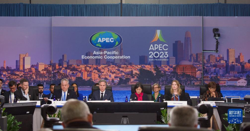 11月14日,美国国务卿布林肯(中左)和贸易代表戴琪(中右)共同主持在旧金山举行的亚太经合组织部长级会议。新华社发(美国国务院供图/贾斯廷·塔佛亚摄)