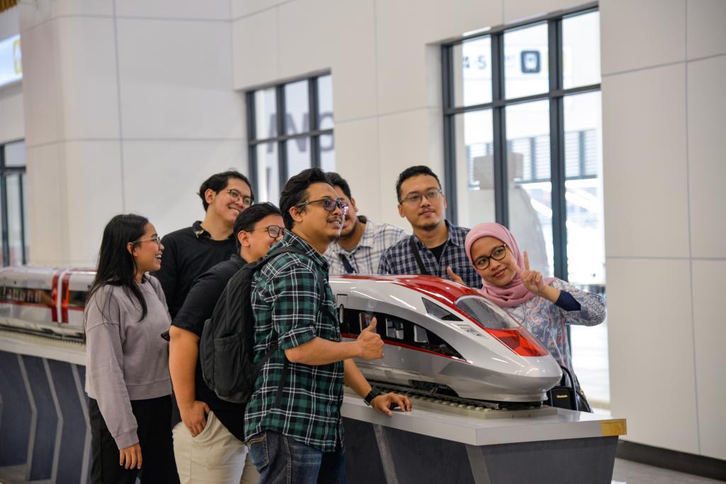 11月17日,在印度尼西亚雅加达的雅万高铁哈利姆站候车大厅,人们和一个雅万高铁高速动车组模型合影。新华社记者徐钦摄