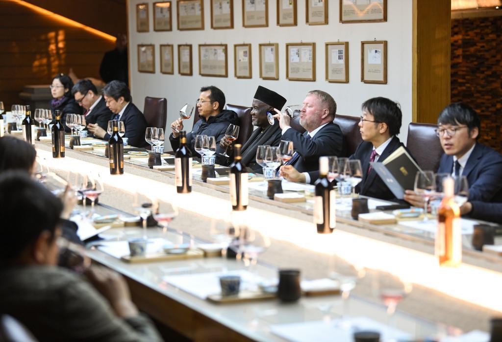驻华使节在宁夏银川市志辉源石酒庄品鉴产自贺兰山东麓的葡萄酒(11月20日摄)。新华社记者 冯开华 摄