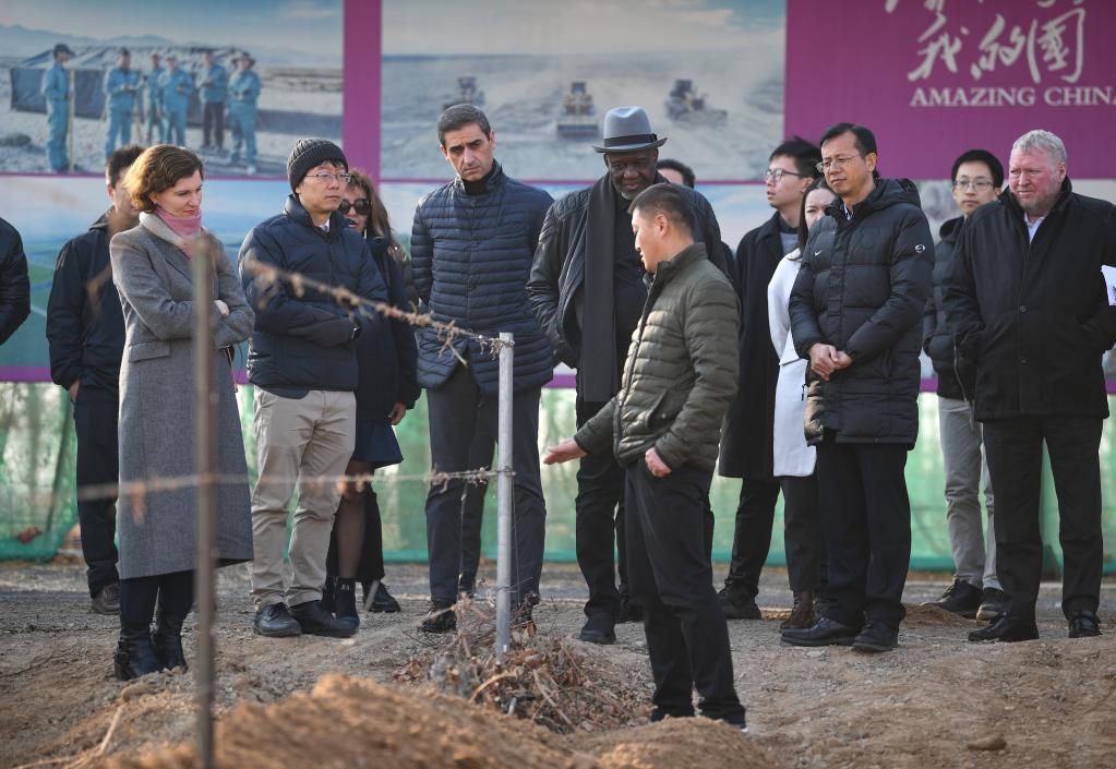 驻华使节在宁夏银川市永宁县贺兰神国际葡萄酒庄了解贺兰山东麓酿酒葡萄冬季埋藤的原因(11月21日摄)。新华社记者 冯开华 摄