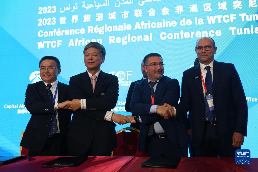 当天,世界旅游城市联合会、突尼斯国家旅游局、突尼斯航空公司和中国首都机场集团有限公司签订四方合作意向书,就开设中突之间直航、促进人员交流往来等达成共识。