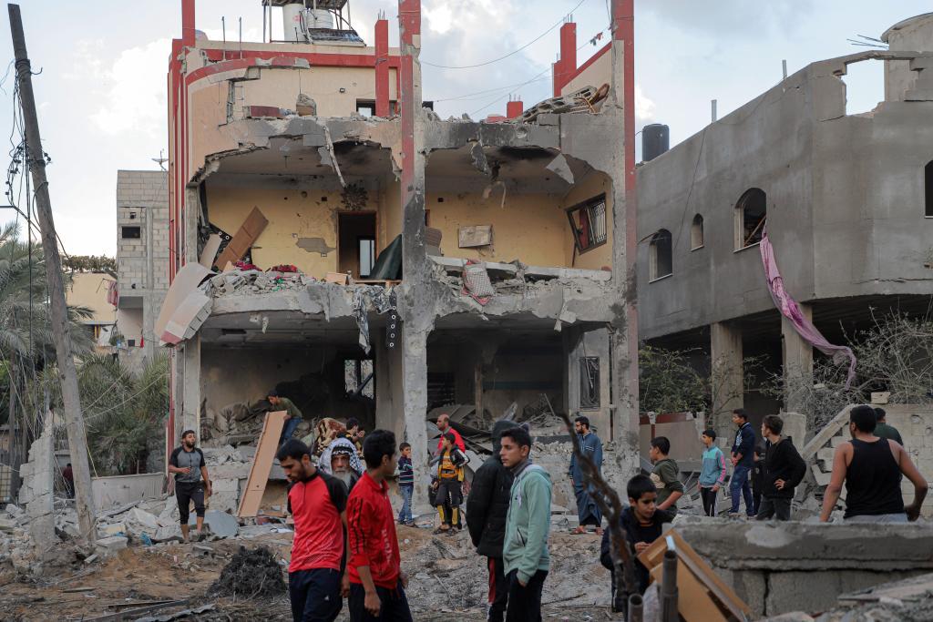 12月1日,以军恢复对加沙地带空袭。图为当日,人们聚集在加沙地带南部城市汗尤尼斯一处被炸的建筑前。新华社发(里泽克·阿卜杜勒贾瓦德摄)
