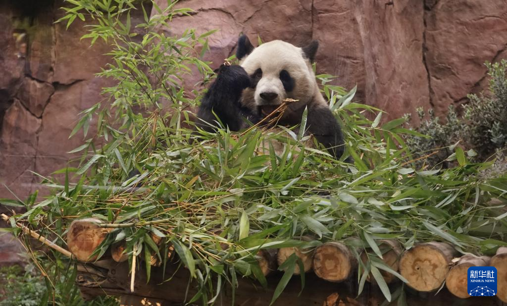 8月8日,大熊猫“云川”在美国加利福尼亚州圣迭戈动物园“熊猫岭”吃竹子。新华社发(曾慧 摄)