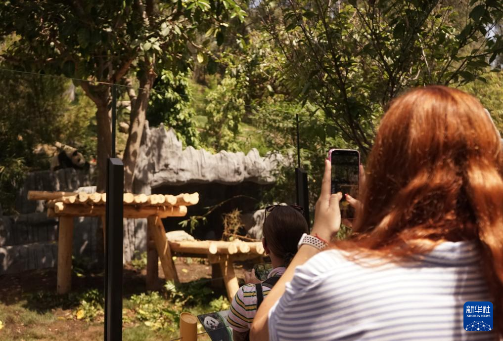8月8日,人们在美国加利福尼亚州圣迭戈动物园“熊猫岭”给大熊猫“鑫宝”拍照。新华社发(曾慧 摄)