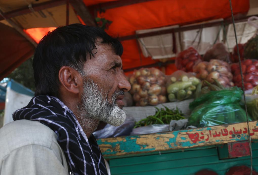 8月13日,在阿富汗首都喀布尔,一位菜贩在摊位前等待顾客。新华社发(塞夫拉赫曼·萨菲摄)