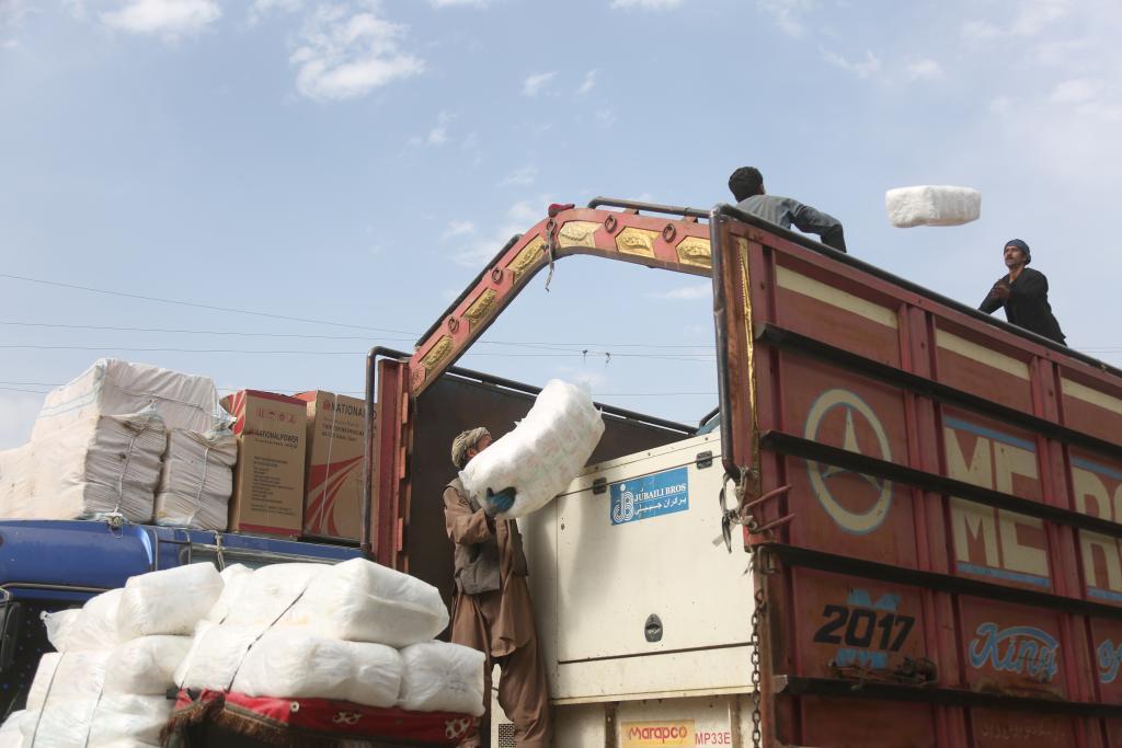 8月24日,在阿富汗首都喀布尔,工人向货车内装载货物。新华社发(塞夫拉赫曼·萨菲摄)