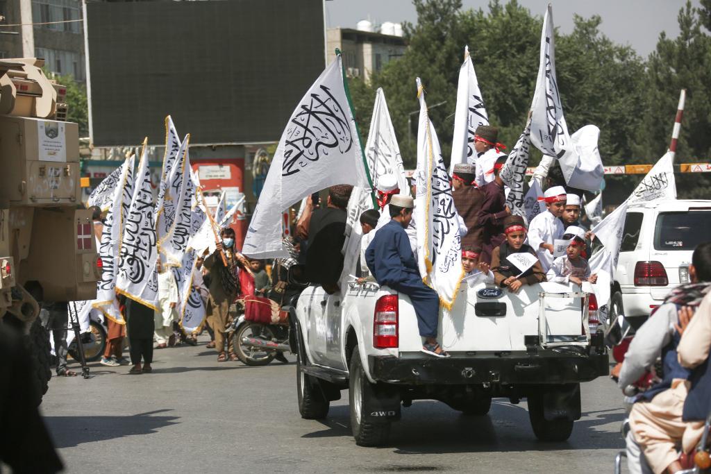 8月14日,人们手持临时政府的白色旗帜出现在阿富汗首都喀布尔街头。新华社发(塞夫拉赫曼·萨菲摄)