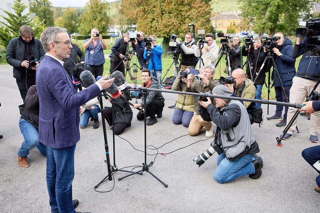 9月29日,奥地利自由党领袖赫伯特·基克尔在奥地利下奥州的一处投票站投票后接受媒体采访。新华社发(乔治斯·施耐德摄)