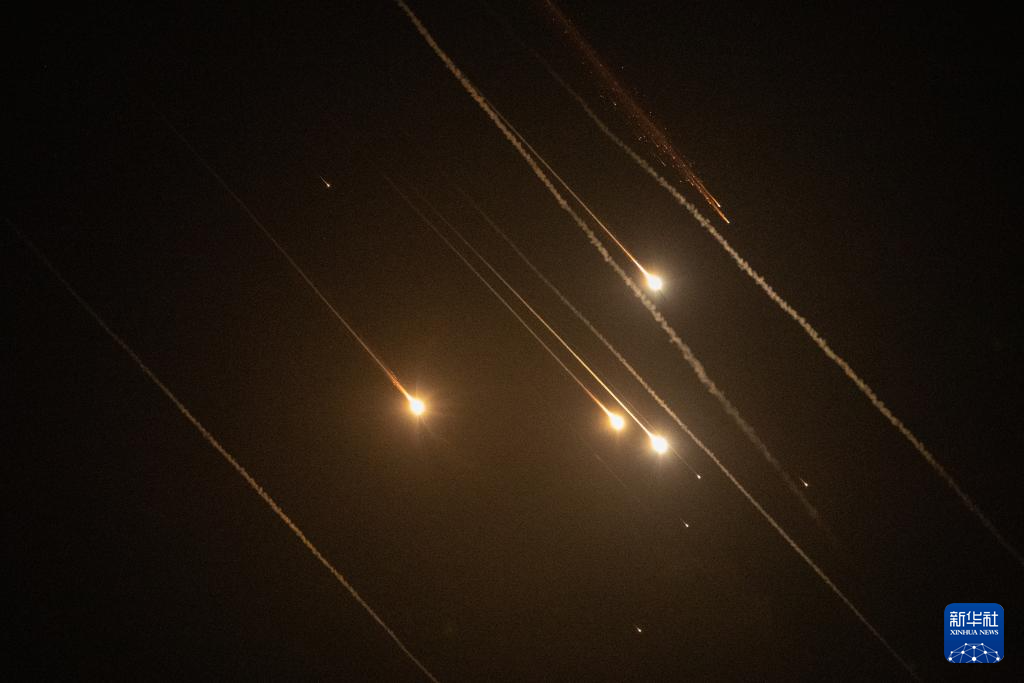 10月1日,以军防空系统拦截的发射物从耶路撒冷上空飞过。新华社发(贾马尔·阿瓦德摄)
