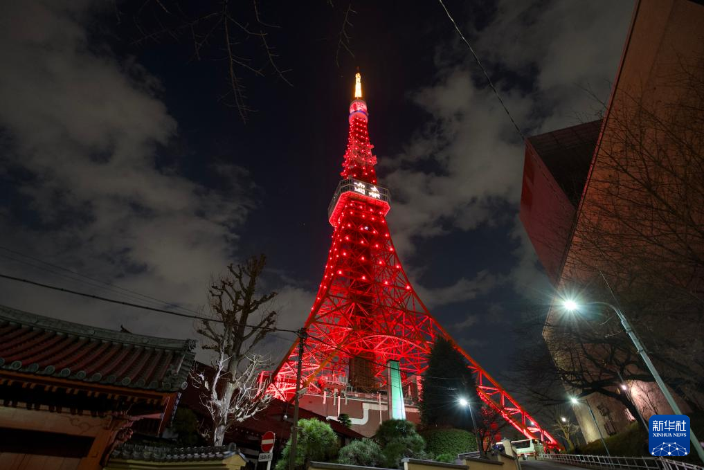 1月28日晚,日本东京的地标性建筑东京塔点亮“中国红”,塔身上显示“迎春”字样,庆祝中国农历新年。(新华社记者李光正摄)
