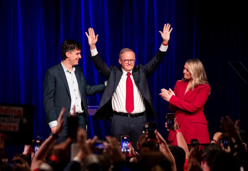 5月3日,在澳大利亚悉尼,澳大利亚总理阿尔巴尼斯(中)在竞选集会上庆祝胜利。新华社记者马平摄