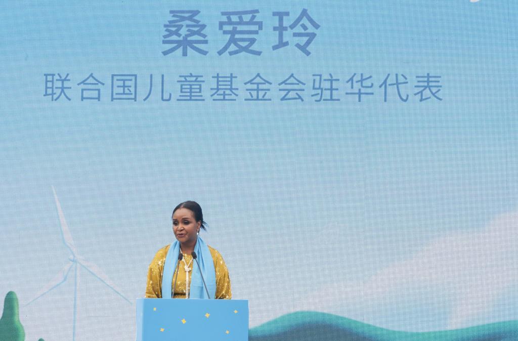 图为2025年5月30日,联合国儿童基金会驻华代表桑爱玲在北京启动的“敢作气候担当”青少年应对气候变化倡导活动上致辞。新华社记者 张玉薇 摄